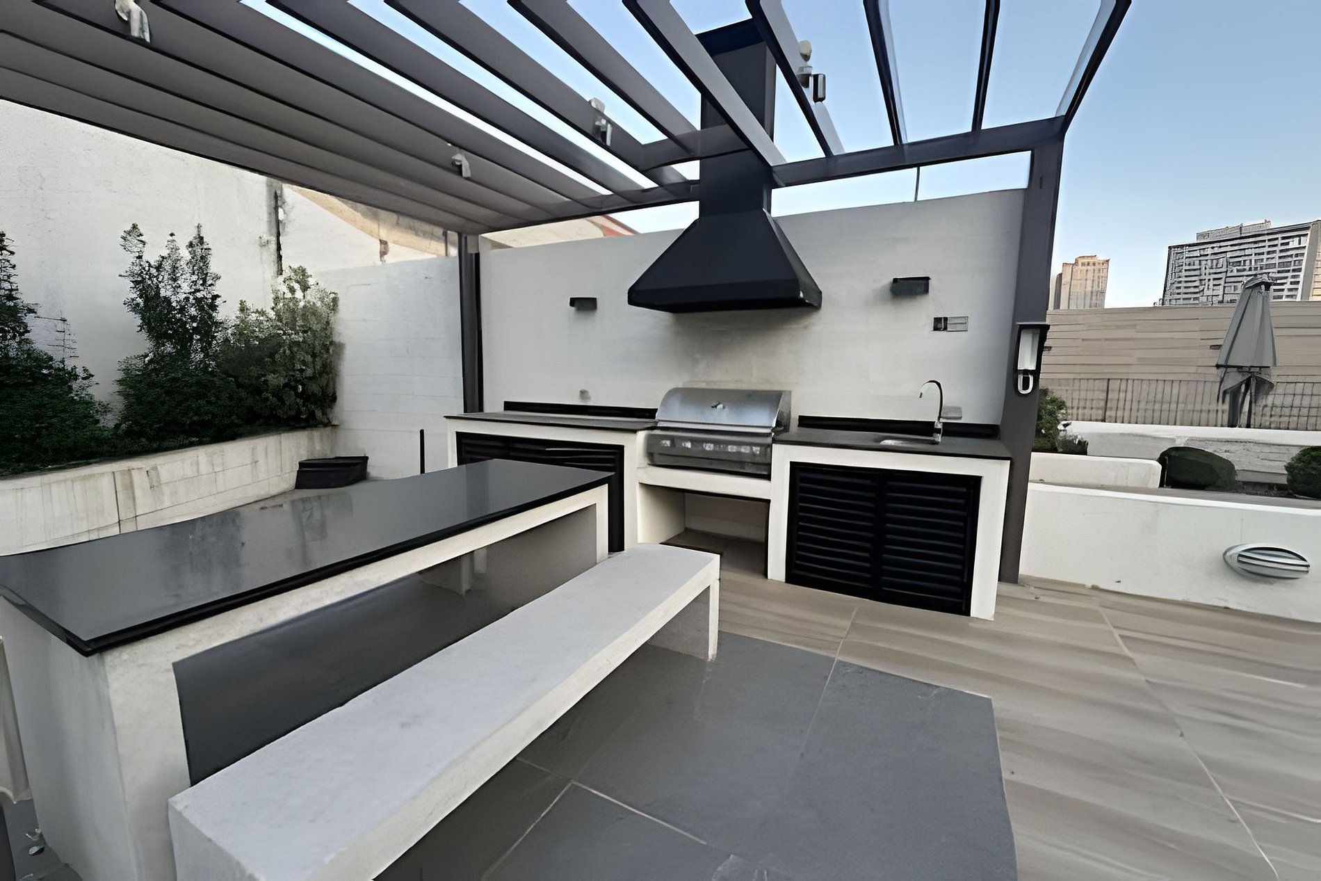 The building stands as a contemporary and functional space designed to provide comfort and well-being in a secure and well-maintained environment. Its facilities include an outdoor swimming pool, barbecue area, green spaces, and an event hall — offering options for both relaxation and social living.