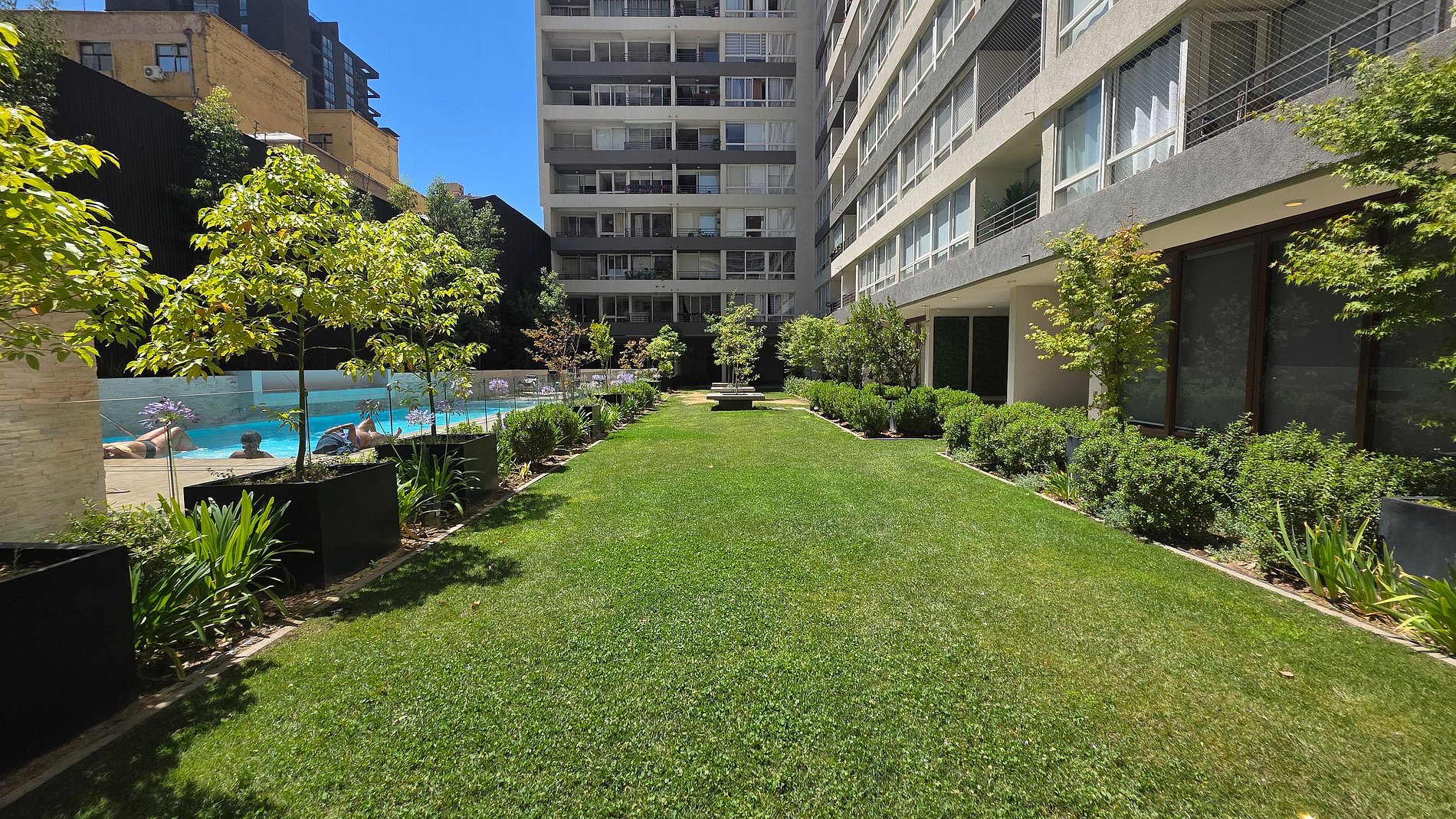 El edificio dispone de áreas comunes compartidas para residentes y huéspedes, como piscina exterior, gimnasio, lavandería, salas de uso común y áreas verdes. Se solicita mantener un uso adecuado de estos espacios y respetar las normas internas, contribuyendo a un entorno ordenado durante toda la estadía.